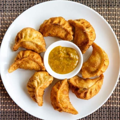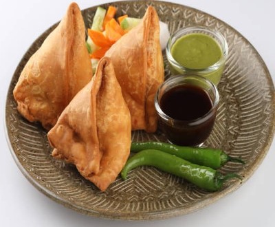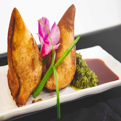 | 2 deep fried crispy pastries with mildly spiced potatoes and... | ||