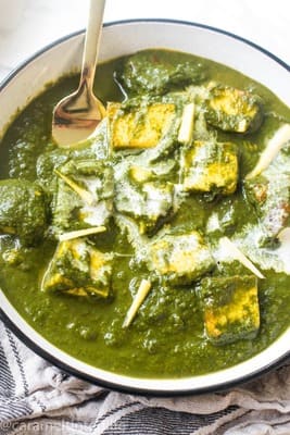 | Home-made cheese cubes cooked in spinach and cream. | ||